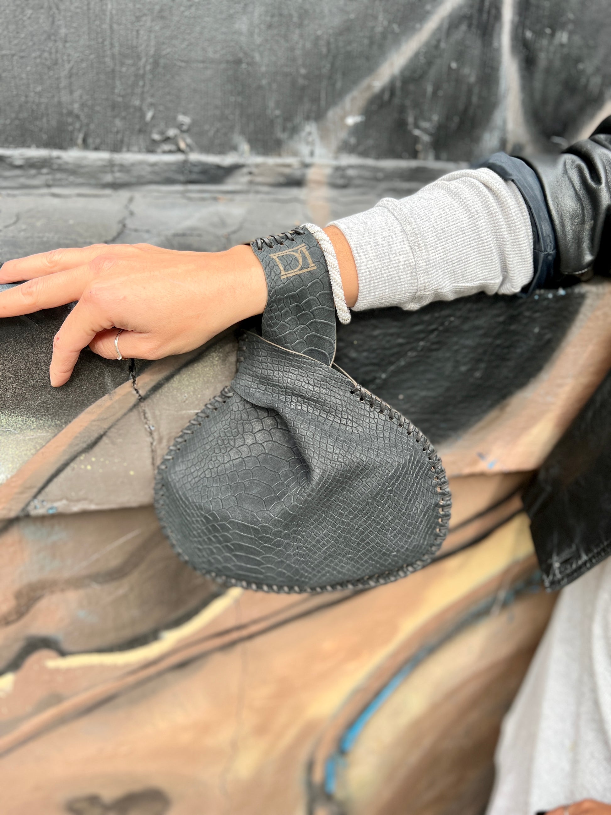 "Black Mamba” Mini Canteen Clutch is hand crafted in a light weight leather featuring an embossed snakeskin pattern with a matte smooth finish.