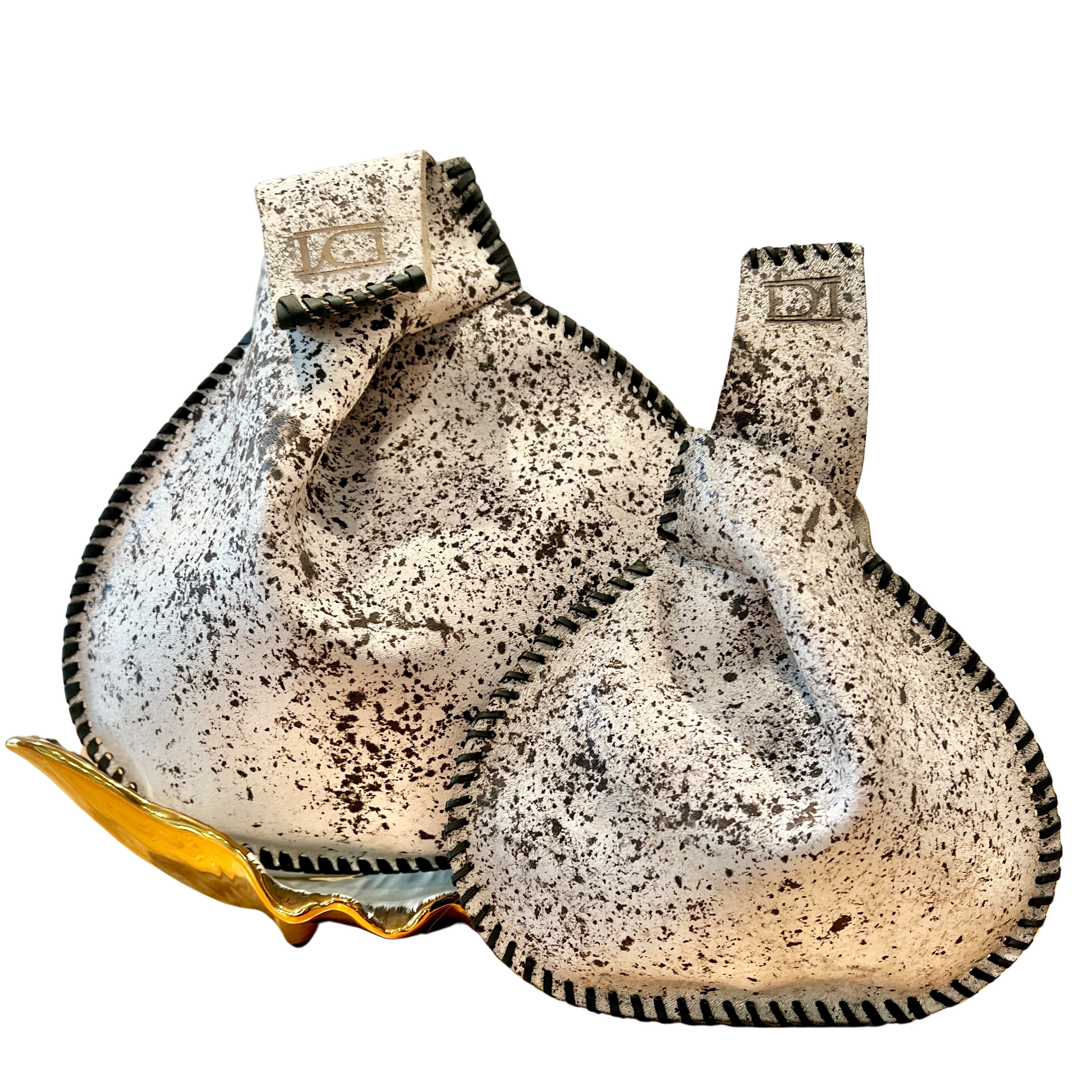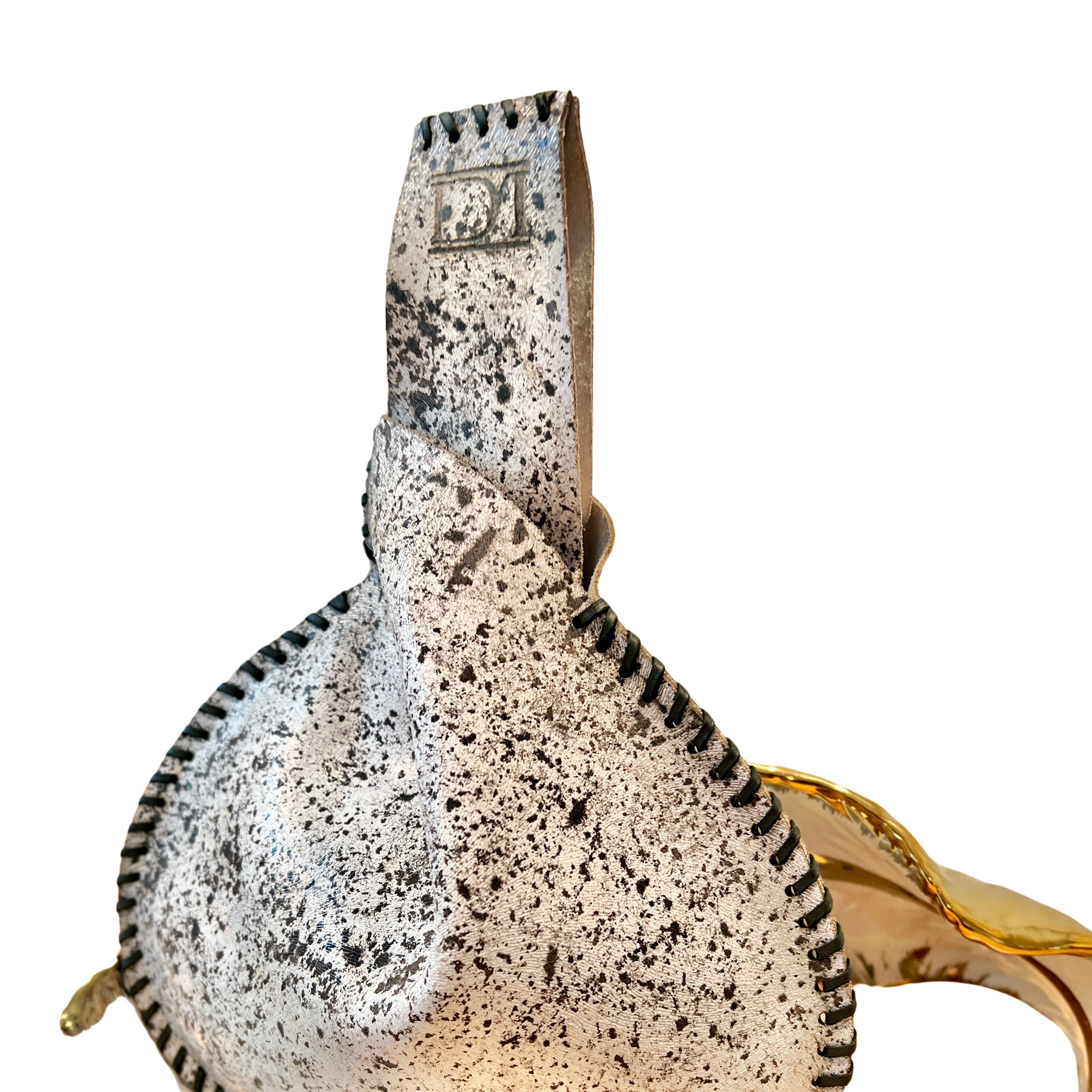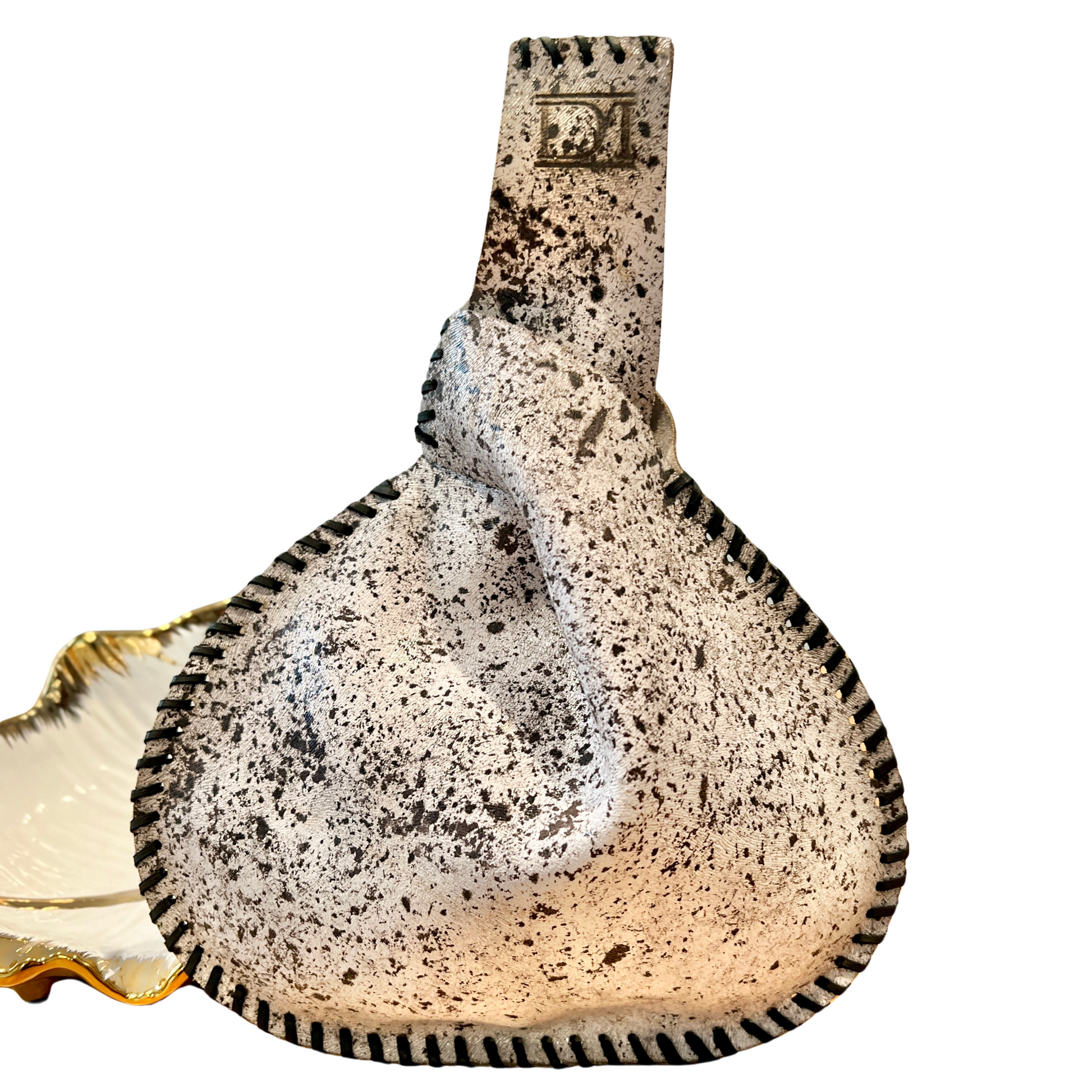 "Go Gh*st Yourself" Mini Canteen Clutch is hand crafted in a medium weight leather detailed with a splatter paint like effect with a slight sheen finish. Gives the illusion of a cowhide! Each side of this bag is unique and one of a kind.
