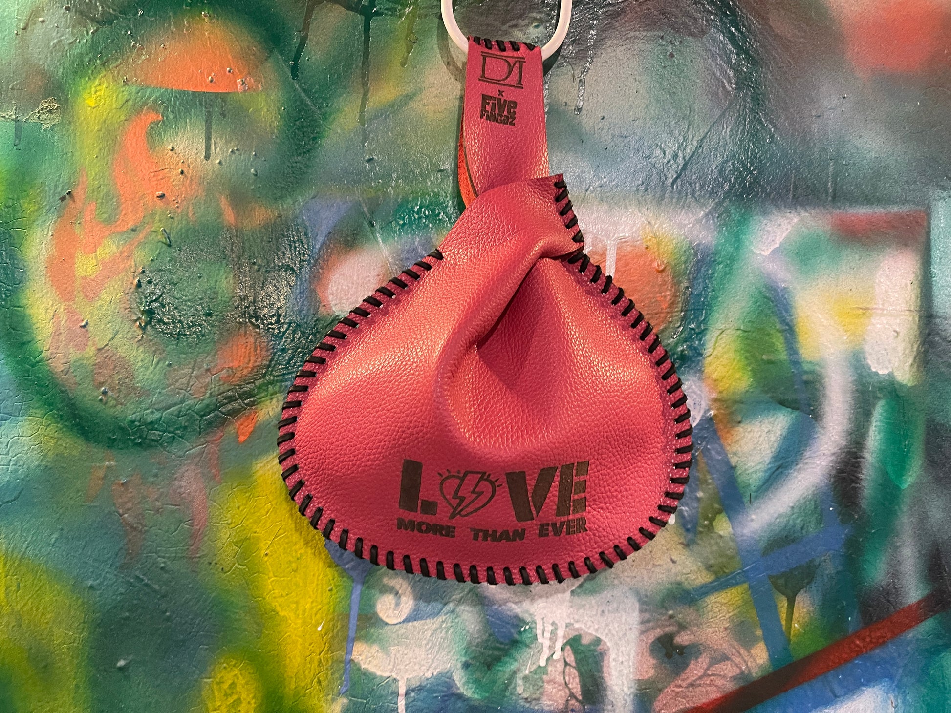 "LOVE" Mini Canteen Clutch is hand crafted in a medium weight leather featuring a natural pebble grain and smooth finish. Limited Edition, Collaboration with the incredibly talented, Norwalk local artist Fivefingaz! We have laser engraved his famous "Love More Than Ever" message to one side of the bag along with his signature at the handle.